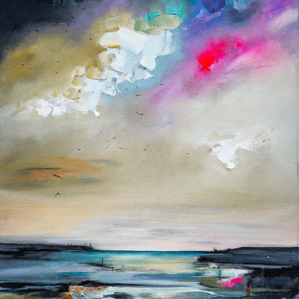 A shared colour palette of bright and enigmatic paintings with stand alone decorative ceramics.