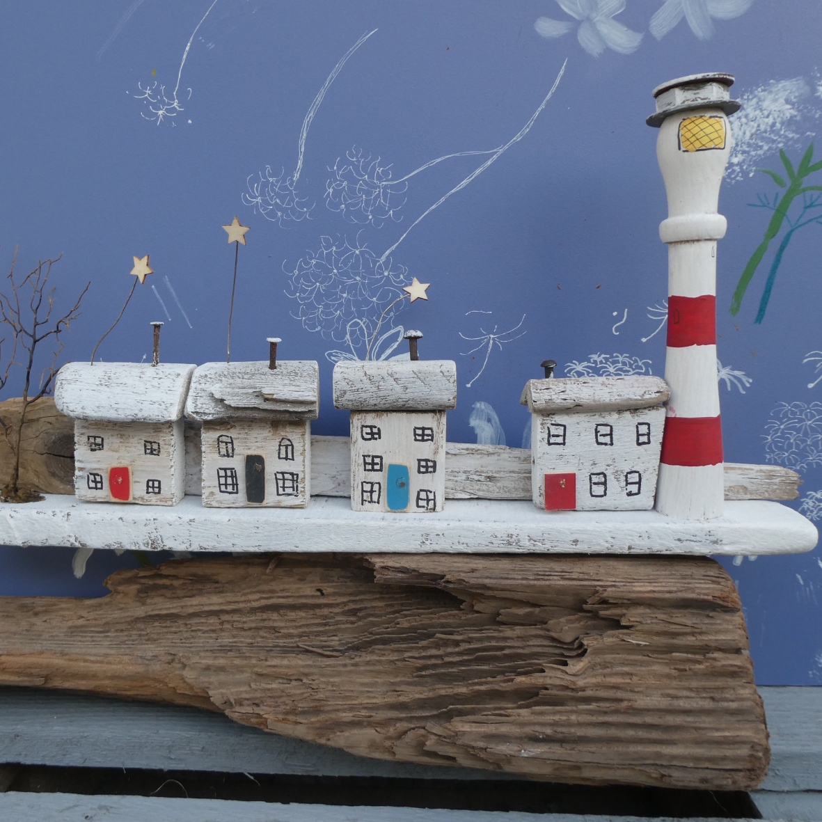 Sculptures and simple shelves handmade from driftwood and recycled hardware.